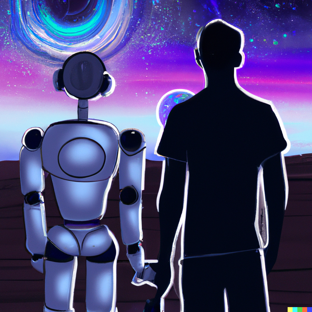 I wanted to play with DALL-E (older versions than the ones availed now). My input: “A robot and a person holding hands and looking into the far unknown. The sky is filled with planets and stars. Digital art blue”.